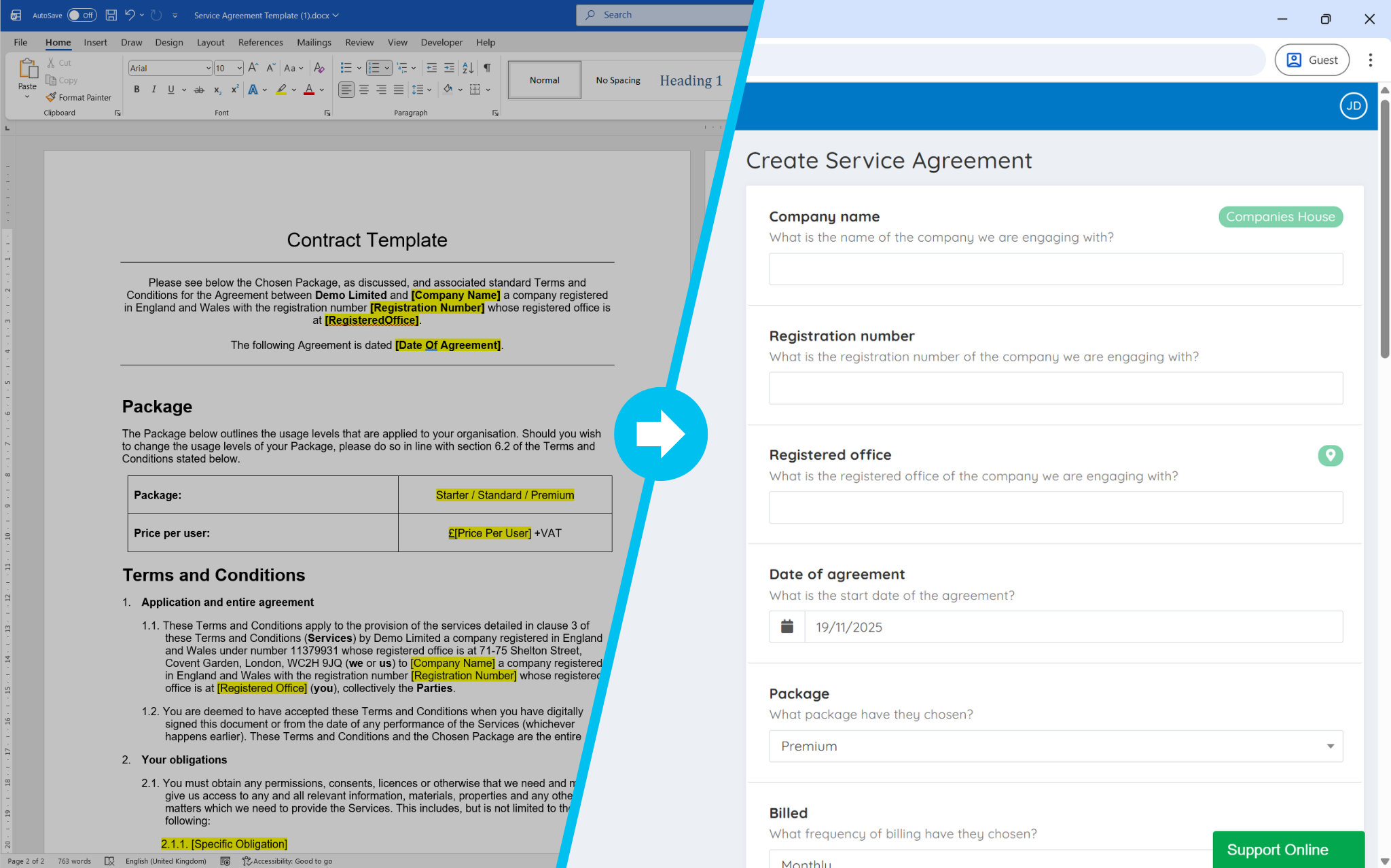 The easiest way is to simply upload one of your existing Word templates right here on this page. Our in-house experts will review your document and get back to you within 30 minutes to confirm if it’s compatible for automation. It’s completely free, requires no technical setup, and is the fastest way to see how Doc2 can work for your specific contracts.